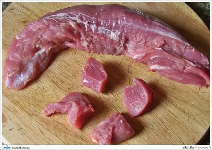 Берем одну полоску вырезки и на доске нарезаем ее на кусочки.