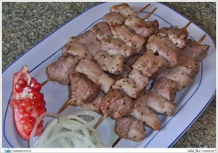 Затем снимаем снимаем крышку и шашлык — на блюдо. Добавим немного лука кольцами и зерен кисло-сладкого граната.