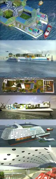 Общая черта всех предложенных эскизов - многоуровневые террасы, всяческие "висячие сады" и, конечно же, вертолётные площадки, а также места для причаливания паромов (иллюстрации Blueseed).