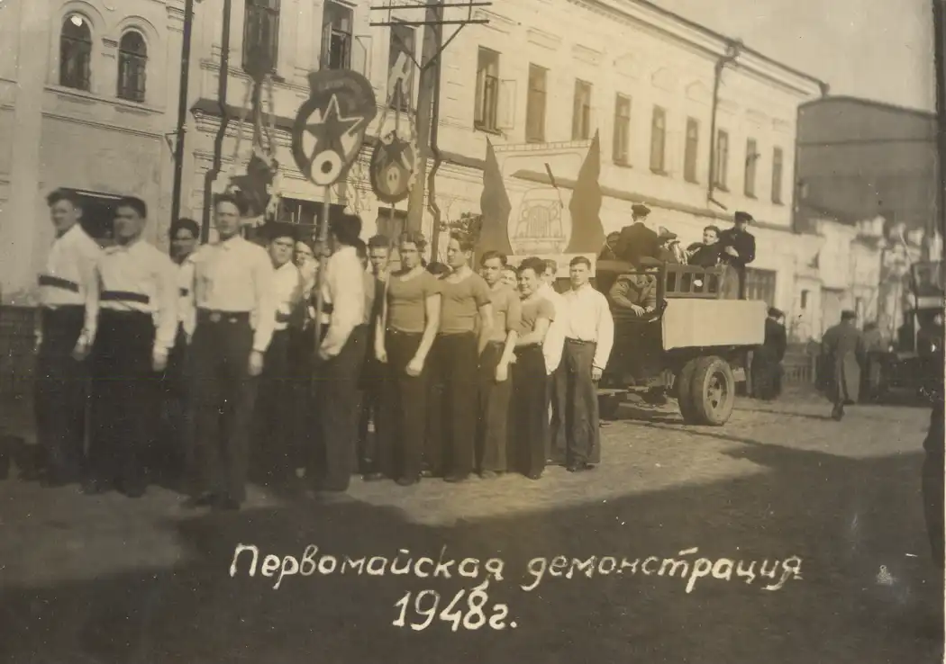 Фото первомайской демонстрации. ОМОНа с дубинками ещё нет, он появится лет через сорок...О маршах несогласных, наверное, и не мечтали.