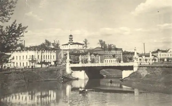 Каменный мост, построенный Австро-Венгерскими пленными во время Первой мировой войны. В годы Великой Отечественной вынес тяжесть грузовых составов, подвозивших уголь на электростанцию ТЭЦ-1. К моменту создания этой фотографии паровозы по мосту уже не ходили, но оставались несколько рельсов до начала 80-х годов. Зато по реке Ушайке можно было прокатится на лодке. Воды хватало всем.