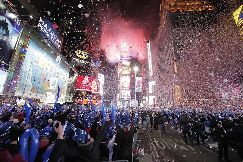 7. Толпа орет, конфетти падает, на Таймс-Сквер начинаются гуляния. Первый новогодний шар в Нью-Йорке на Таймс-Сквер появился в 1907 году. Тогда в нем было сто 25-ваттных лампочек 1,5 метра в диаметре, он весил 300 кг и был сделан из железа и дерева. (Lucas Jackson / Reuters)