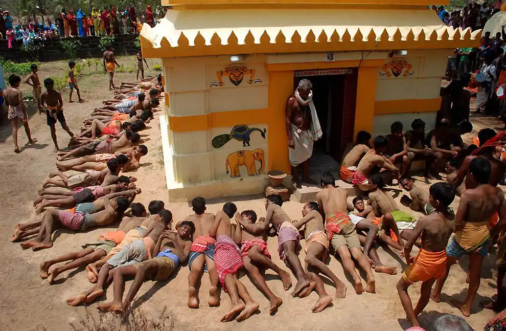 12. Индийцы катаются вокруг храма, преподнося традиционные молитвы богу Шива во время ритуала в рамках фестиваля, который совпадает с Новым годом Орийя в Мендхасале, Индия. Фестиваль Данда длится 13 дней. В Новый год также празднуют приход весны. В индуизме нет одного общего празднования Нового года. В каждом регионе свои обычаи и даты. (AFP - Getty Images)