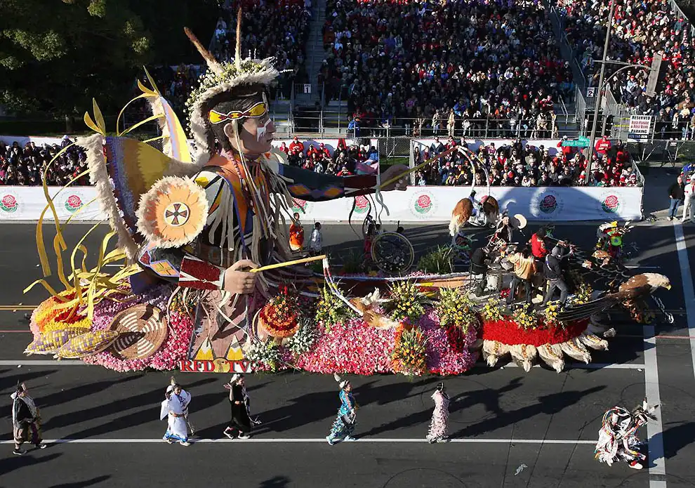 22. Движущаяся платформа «Одна Нация» на 122-ом ежегодном Параде род в Пасадене, Калифорния. Парад роз начался в 1890 году в рамках рекламной акции, когда Пасадену называли «Средиземноморьем Запада». Во время парада люди играют в разные игры под теплым солнцем. Цветы стали неизменной деталью многих местных традиций, так как их полно здесь круглый год. (Frederick M. Brown / Getty Images)