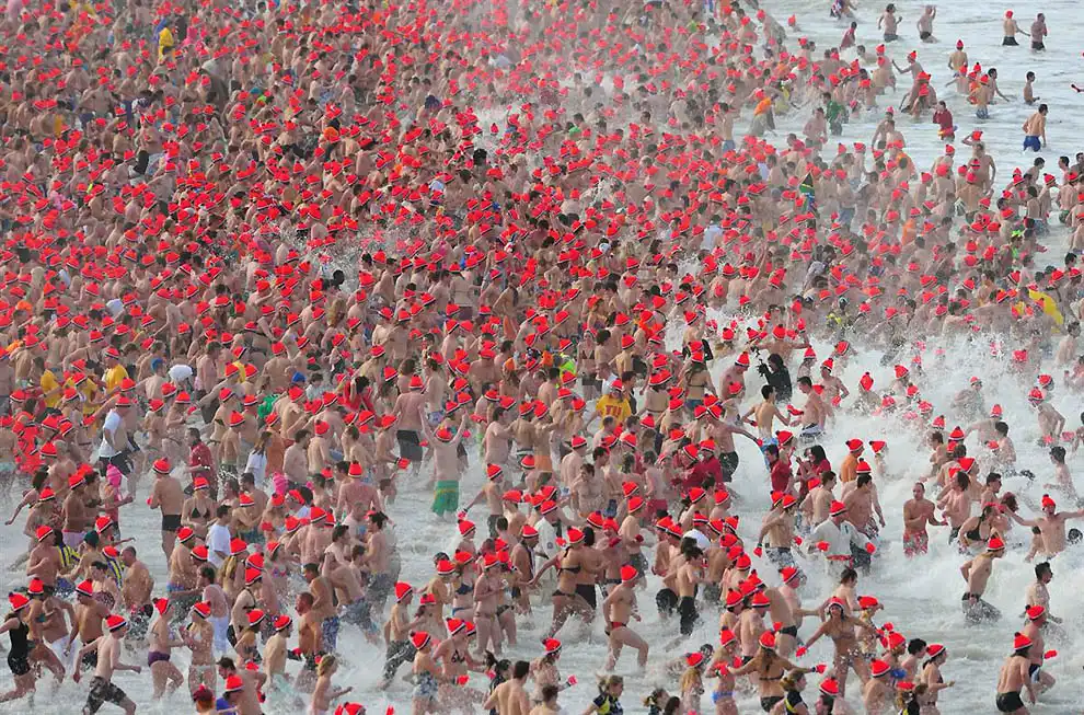 3. Голландские пловцы в ледяном Северном море в Шевенингене, Нидерланды. В Северной Америке клуб моржей помог популяризовать традицию купания в ледяных водах зимой. Бернарр Макфадден, основавший Клуб моржей Кони-Айленда в 1903 году, считал, что «купание в океане зимой поможет укрепить иммунитет и жизнеспособность». (Jasper Juinen / Getty Images)
