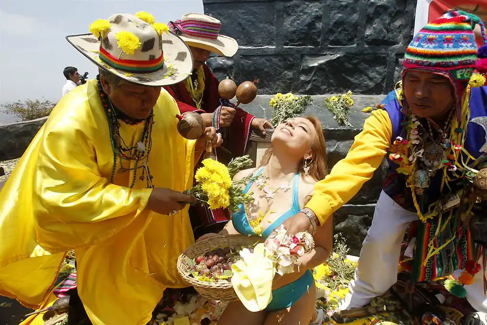 4. Девушка держит подношения из фруктов, пока шаманы проводят ритуал на удачу в новом году в Лиме, Перу. В Перу желтый цвет приносит удачу, и люди часто надевают желтые купальники на удачу. Шаманы со всей страны приходят на ярмарки и празднества, чтобы совершить различные ритуалы – осыпать людей желтыми цветами или посадить на тело морскую свинку. (Mariana Bazo / Reuters)
