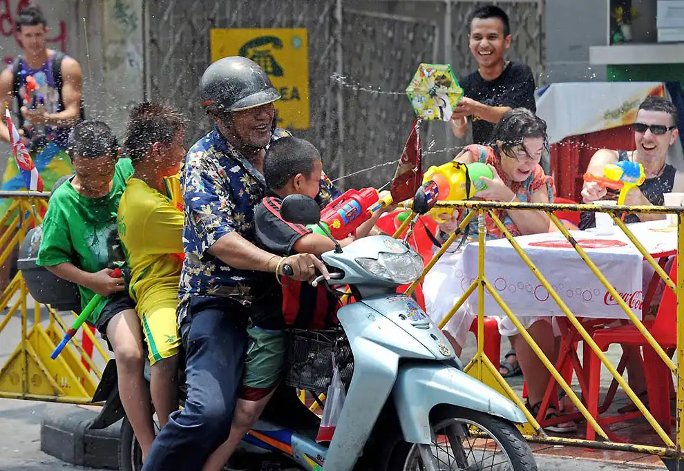 8. Тайские дети и иностранные туристы обливаются водой во время фестиваля Сонгкран в Бангкоке. Сонгкран – тайский Новый год, который начинается 13 апреля. В это время года стоит жара, и люди отмечают праздник, обливаясь водой. Этот ритуал произошел от традиции обливать ароматной водой изображения Будды в знак очищения. Затем собранную «благословенную» воду выливали на членов семьи на удачу. (Pornchai Kittiwongsakul / AFP - Getty Images)