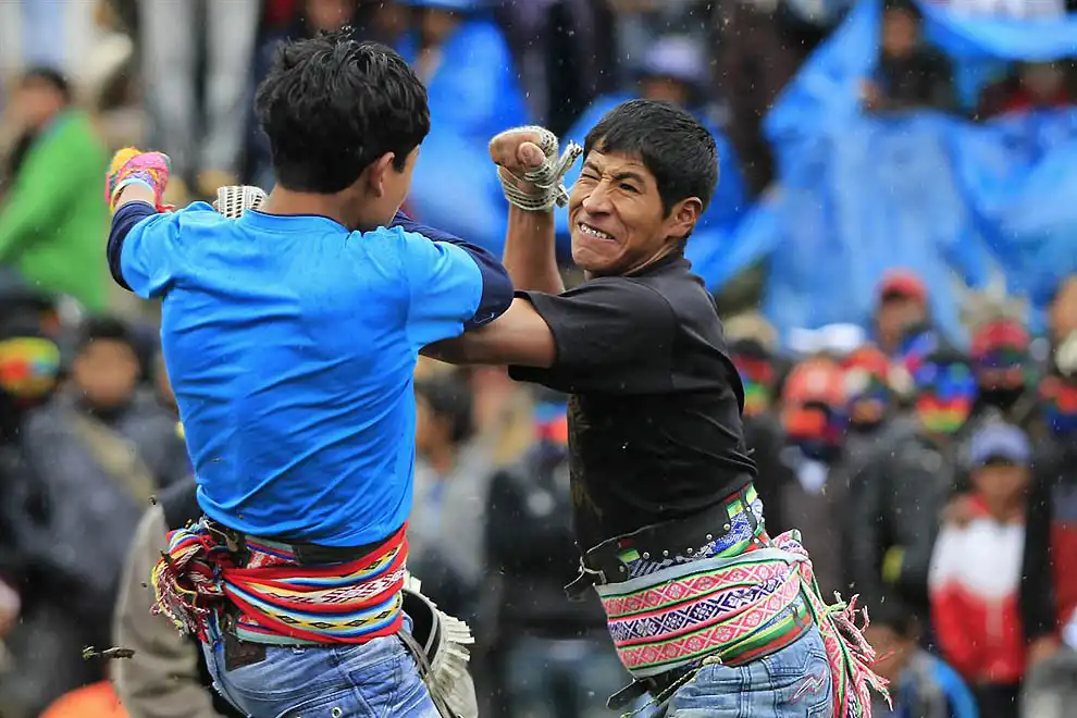 15. Андские мужчины дерутся во время традиционного фестиваля Таканакуй в провинции Чумбивилкас в Куско, Перу. Таканакуй, что переводится как «когда закипает кровь» с языка кечуа, - ежегодное и древнее празднование, произошедшее от доиспанской культуры Чанка, которое дает сотням жителей андских деревушек решить проблемы личного характера, чести и частной собственности путем силы кулаков. (Enrique Castro-Mendivil / Reuters)