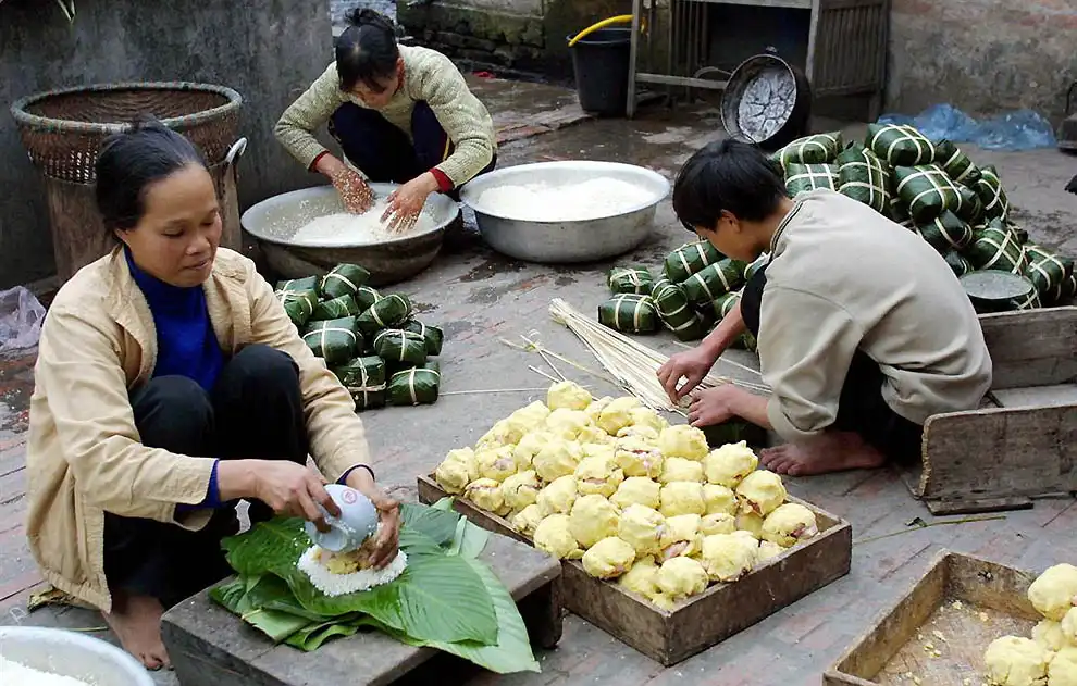 21. Родственники делают традиционные новогодние рисовые лепешки бан чунг во дворе дома в пригороде Ханоя, Вьетнам. Бан чунг – деликатес из липкого риса, свинины и зеленых бобов, завернутых в листья «донга». Блюдо готовят 10 часов. Еда – важный аспект новогодних традиций для всех культур и стран. Свинина и ветчина очень популярны на Филиппинах, в Австрии, Германии и Швеции. (Hoang Dinh Nam / AFP - Getty Images)