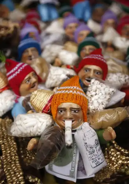 13. Куклы Экекоса, известного как бога изобилия, на рынке в Лиме. Каждый год люди приходят на традиционные рынки в поисках амулетов счастья и духовных ритуалов от шаманов, чтобы те благословили их перед Новым годом. Люди приносят миниатюрные версии вещей, которые они хотели бы иметь, а затем осчастливливают Экекоса, например, дав ему покурить. (Pilar Olivares / Reuters)