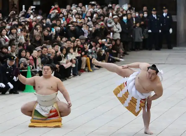 14. Чемпион сумо Асасоруи исполняет ритуал очищения у храма Меидзи Дзингу в Токио. Борцы сумо отмечают Новый год ритуалом перед хамом Меидзи Дзингу. (Junko Kimura / Getty Images)