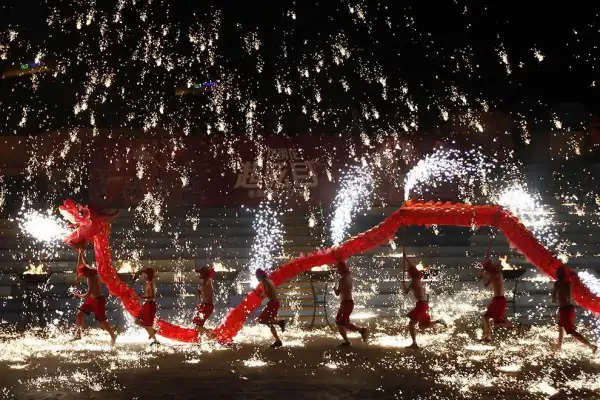 1. Артисты исполняют танец огненного дракона на храмовой ярмарке в честь Китайского Нового года в Пекине. Традиционный танец дракона сопровождается громкими ударами барабана и тарелок, которые прогоняют злых духов в новом году. Празднества проходят за 15 дней до Нового года по лунному календарю, который выпадает на новолуние и означает конец зимы. (Grace Liang / Reuters)