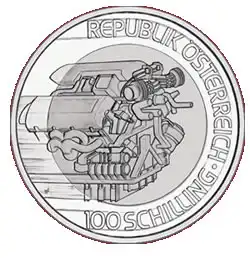 100 Австрийских шиллингов. Серебро 900, вкладка — титан.