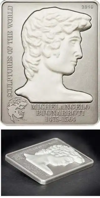 Первая монета из серии о выдающихся скульптурах мира со вставкой миниатюрной скульптуры из настоящего мрамора.