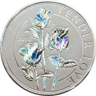Три розы на монете выполнены в технике уникальной переливающейся всеми цветами радуги голограммы.