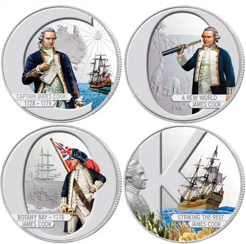 Набор из четырех монет. Реверсы монет вместе составляют слово "Cook". Тираж составляет 1779 наборов т.е. год, в котором Кук был убит туземцами на Гавайях.