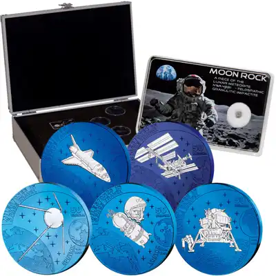 Уникальный набор, посвященный основным вехам в освоении космического пространства. В набор, помещенный в металлический чемоданчик "космонавта", изготовленный из алюминия, входят пять монет и капсула с частицей лунного метеорита.