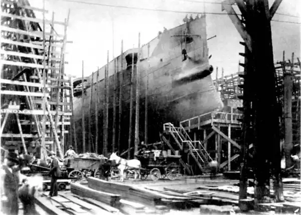 Крейсер 'Варяг' на стапеле перед спуском на воду.