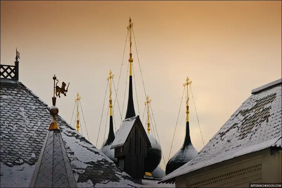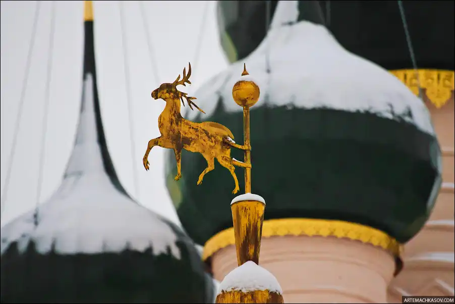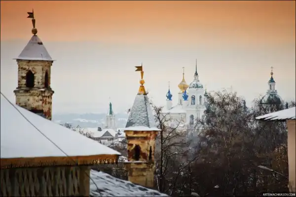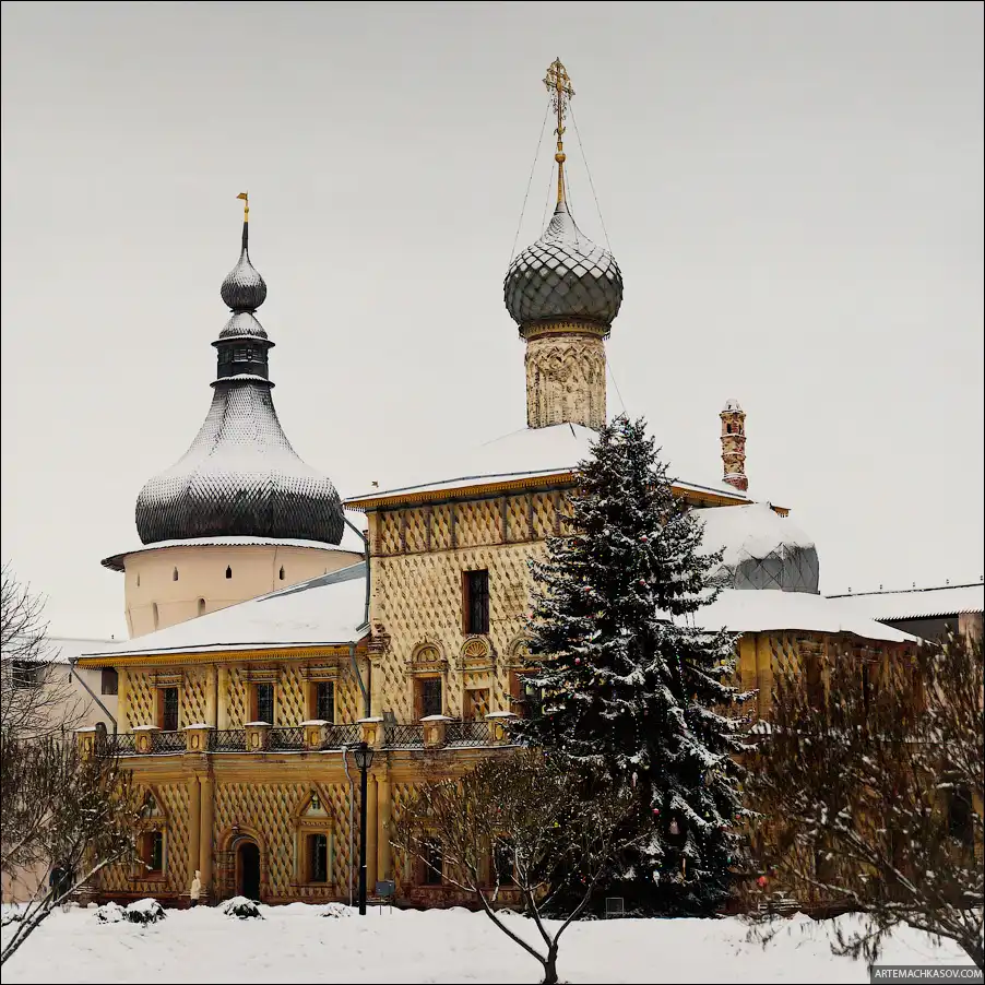 Наряженная ель на фоне храма. В крытых переходах крепостных стен гнались друг за другом герои классического советского кино-хита «Иван Васильевич меняет профессию».