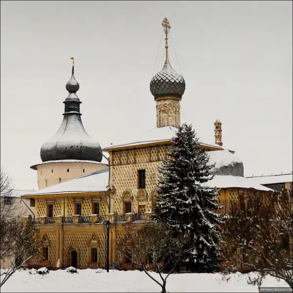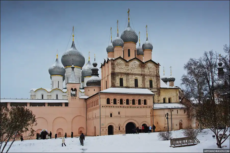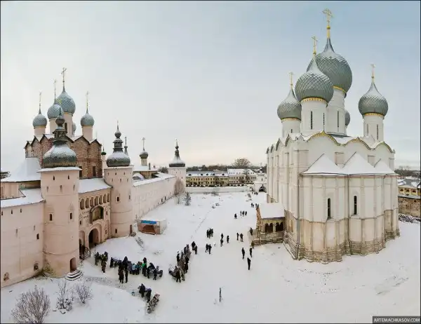 Ростовский Кремль был построен на берегу озера Неро в конце 17 века и отличается от многих старинных русских крепостей изысканностью своего архитектурного облика. Его стены изначально не проектировались для оборонительных целей (больше – для декоративных), да и назывался Кремль раньше не Кремлем вовсе, а митрополичьем двором. В этом нет ничего удивительного, так как строили этот комплекс как резиденцию митрополита, где она и находилась некоторый период времени, после чего переехала в Ярославль.