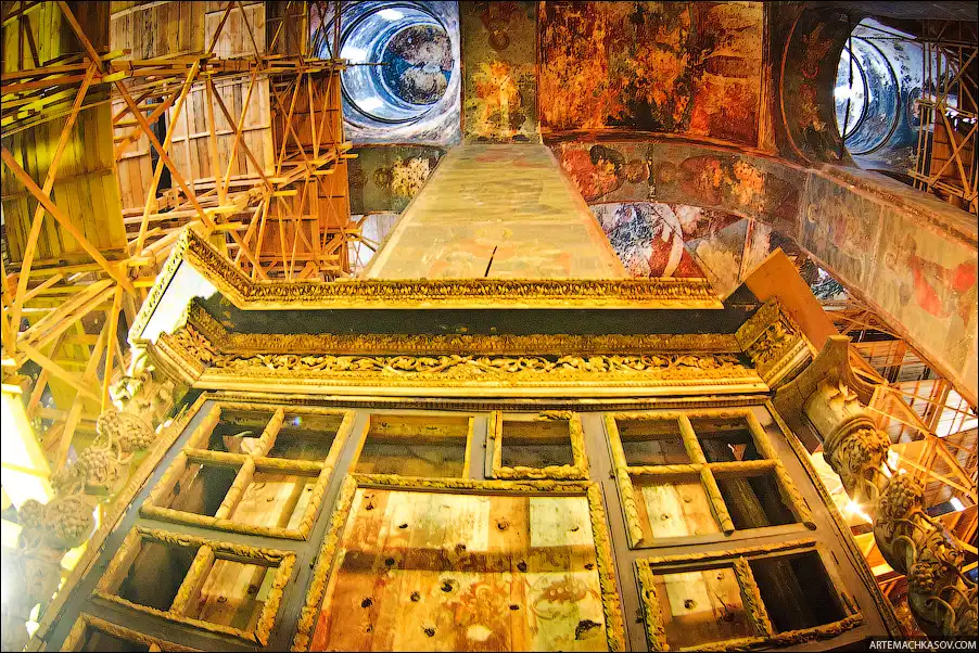 В храме активно ведутся реставрационные работы. Многие иконы демонтированы.