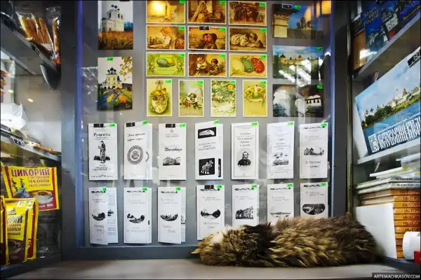 Вход на территорию Кремля стоит 50 рублей, каждая музейная экспозиция – 50-80 рублей, полный билет – 450 рублей. Мы смотрели только архитектурный ансамбль (это 50 рублей), плюс 200 рублей стоит разрешение на фотосъемку. Тем временем в сувенирной лавке отдыхает от дел мирских пушистое котэ.