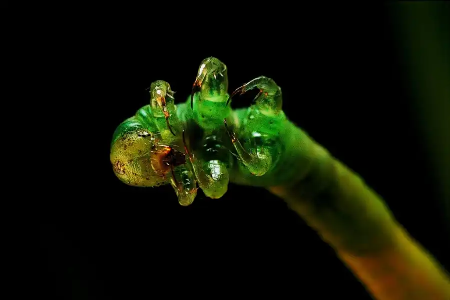 Сегодня мы познакомимся с гусеницей моли Eupithecia orichloris. Охотится она на мух, мушек и прочих насекомых, подходящих ей по размеру.