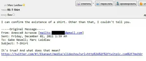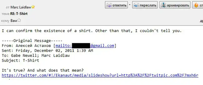 Автор твита, Ekanaut, утверждает, что видел разработчиков Valve в таких футболках на каком-то локальном мероприятии для геймдевелоперов. Кстати, твит был помечен хеш-тегом #ValveTrolling. Видимо, автор считает (или делает вид), будто бы все это специальные проделки Valve. Русский фанат, Алексей Астахов, решил испытать судьбу и отправил в Vavle письмо, в котором дал ссылку на твит и спросил, правда ли это и что означает. Неожиданно, ответ был получен. Марк Лэйдлоу, сотрудник Valve ответил: