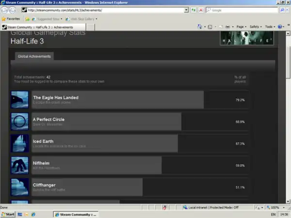 Еще одна новость буквально через несколько дней опять трясет сообщество нетерпеливых любителей халфлайфа. Якобы в Сеть просочился список достижений для Half-Life 3. Опять же, почти наверняка это утка, но весьма качественная. Фанаты начали пристально разглядывать изображение достижений и уже увидели там моменты продолжения.