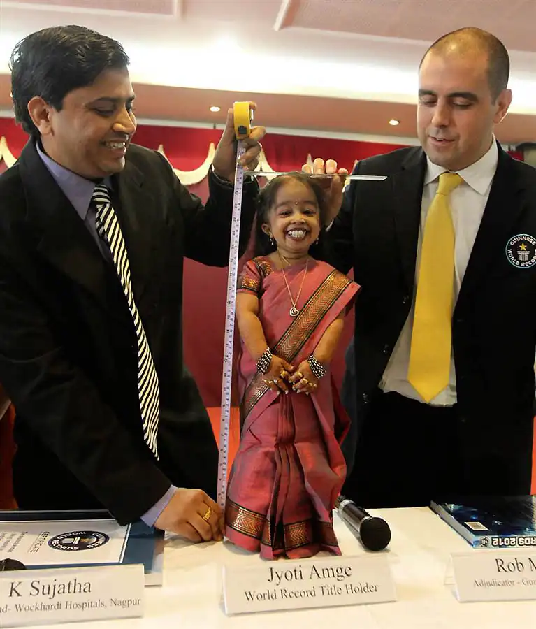 Эксперт Роб Моллой (справа) и врач К. Суджатха (слева) измеряют рост Джйоти Амге. При возрасте 18 лет ее рост на 16 декабря 2011 года составлял 62,7 см.