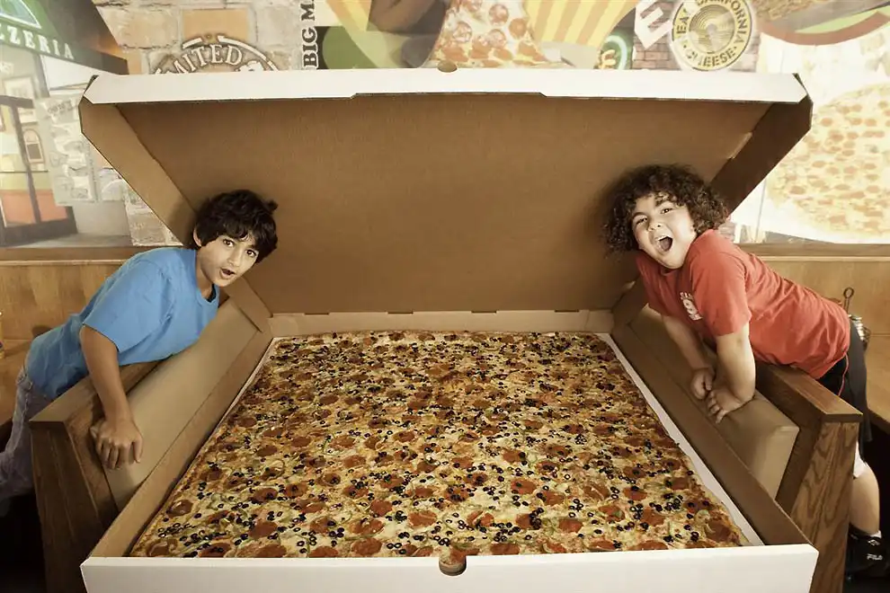 В меню Big Mama’s and Papa’s Pizzeria в Лос-Анджелесе есть квадратная пицца со стороной в 123 сантиметра, которую можно купить за $199.99. Ею можно накормить 100 человек и заказать с доставкой на дом – если предупредить пиццерию за 24 часа.