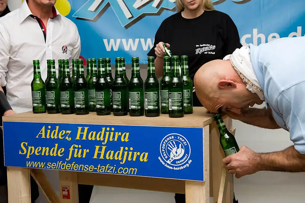 Рекорд, поставленный Ахмедом Тафзи в Гамбурге составляет 24 бутылки.