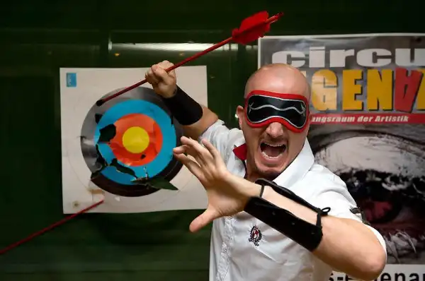 Джо Александер из Гамбурга поймал с завязанными глазами четыре стрелы.