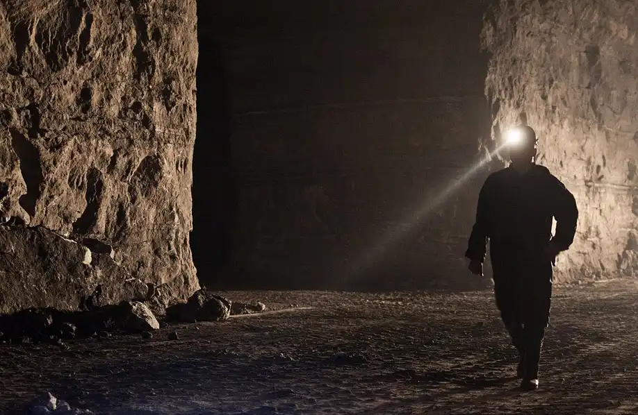 Спуск на 130 метров под землю. Добываемая порода - гипсовый камень, это 11-тиметровый слой на этой глубине.