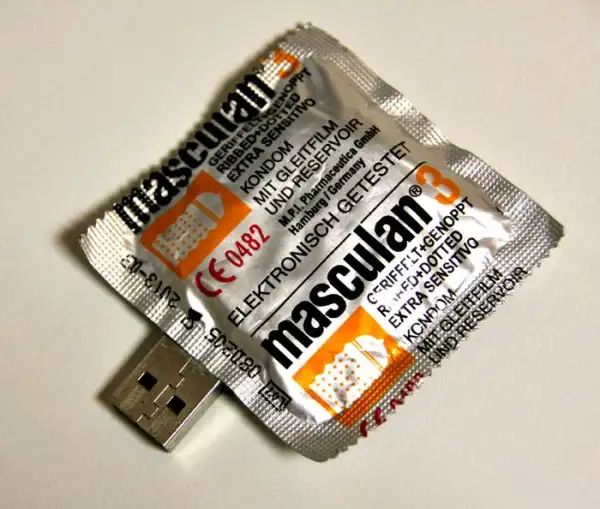Нет, безопасная она не потому, что находится в упаковке от презерватива. Безопасная она потому содержит специальное программное обеспечение, которое проверяет все файлы и не позволяет закачать на себя вирусы.