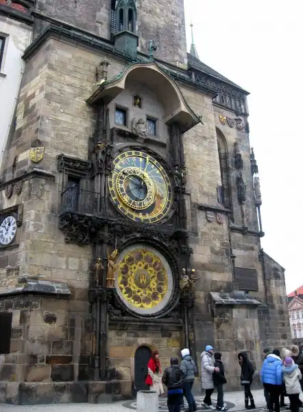 Куранты на Староместской ратуше. Множество людей собирается, чтобы посмотреть их бой. Это целое представление, в котором участвуют фигурки Смерти, Турка, Транжиры, Скряги с кошельком и святых