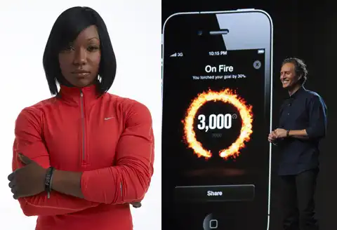 Слева: вместе с представителями компании новинку презентовали несколько спортсменов, в частности спринтер Кармелита Джетер (Carmelita Jeter). Справа: Оландер демонстрирует, как выглядят текущие данные с FuelBand на экране смартфона (фотографии Nike).