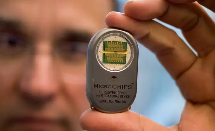 Экспериментальный «беспроводный прибор с микрочипом для поставки лекарств» (Wireless Microchip Drug Delivery Device) — детище группы учёных из Массачусетского технологического института и созданной ими компании MicroCHIPS.