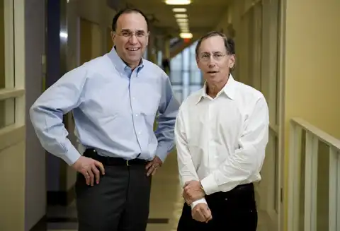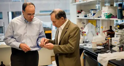 Основные изобретатели чипа — профессора Майкл Сима (Michael Cima, слева) и Роберт Лангер — работают в институте исследования рака имени Дэвида Коха (KI) Массачусетского технологического института. Неудивительно, что своему изобретению они прочат успех и в этой области медицины (фото M. Scott Brauer/ MIT).