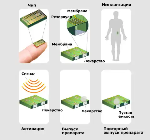 В центре прибора расположен собственно чип с лекарствами. Они размещены в 20 микроскопических ампулах, покрытых очень тонкой мембраной из платины и титана. Их абсолютная герметичность гарантирует сохранность даже сравнительно нестойкого препарата в течение большого срока.