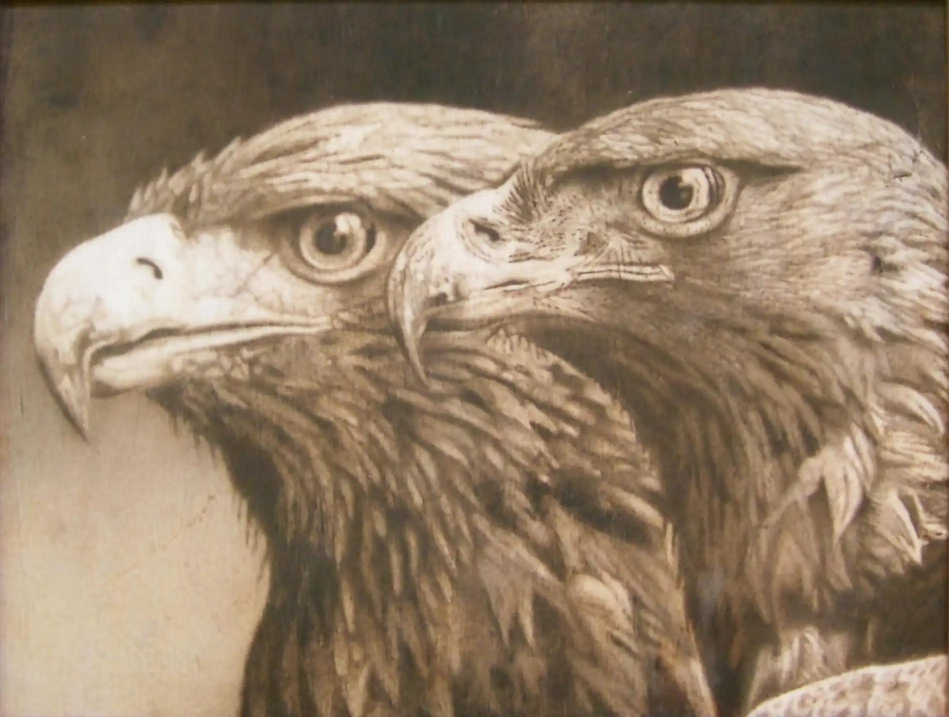Главное отличие техники воздушной пирографии от всем известного контактного способа выжигания - возможность создавать плавные тоновые переходы, от слабо коричневого до чёрного цвета, получая изображение, передающее на плоскости любую глубину трёхмерного пространства без изменения рельефа поверхности.