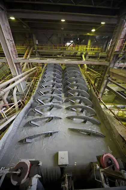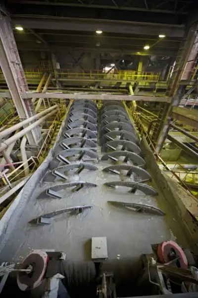 На следующем этапе спиральные классификаторы разделяют сырье в зависимости от его плотности и размера. Принцип работы очень прост. Вода подхватывает мелкие частицы и уносит в слив. Крупные частицы (размером до нескольких сантиметров) вода унести уже не в может – они оседают в нижней части резервуара, после чего спираль поднимает их наверх.
