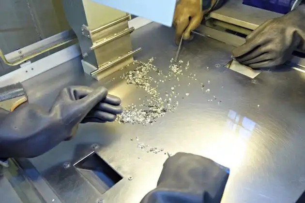 Разумеется, поток воздуха внутри сепаратора не может отделить только один маленький кристалл – вместе с ним отсеивается и какое-то количество пустой породы. По сути, весь процесс обогащения руды направлен только на то, чтобы минимизировать количество этого «пустого» материала и потом облегчить ручную обработку. Причем «ручную» в буквальном смысле слова: специалисты выбирают кристаллы, чистят их и проводят так называемую «конечную доводку». Как бы ни популярно сейчас было желание автоматизировать вообще все производственные процессы, но вот в алмазодобыче обойтись без человеческого фактора совершенно невозможно. Численность сотрудников компании (на декабрь 2010 г.) – более 31 000 человек.