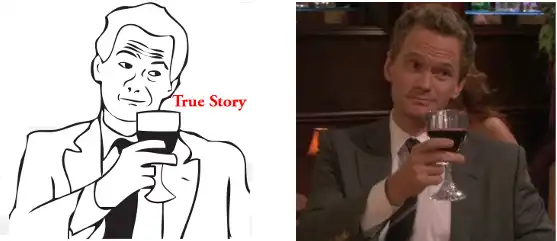 Черно-белый рисунок, состоящий из человека с бокалом вина и надписи True Story (Правдивая история). Обычно используется как заключительная сцена, показывающая, что комикс основан на реальных событиях.
