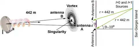 Схема опыта в Венеции. Для правильного приёма закрученной радиоволны использовались две приёмные антенны (иллюстрация Fabrizio Tamburini et al./ New Journal of Physics).