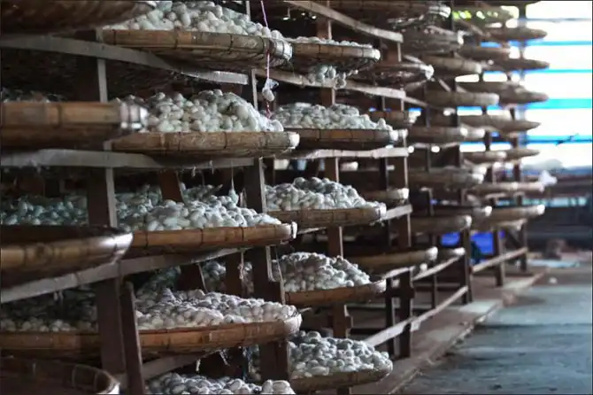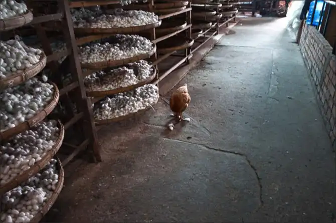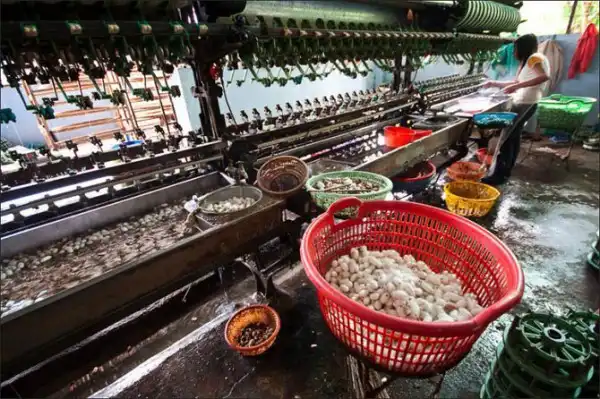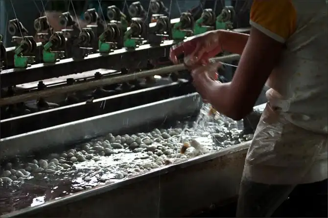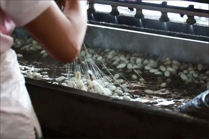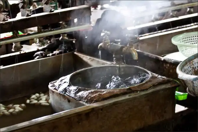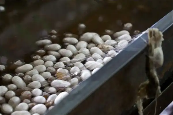 Далее их кладут в длинное корыто с водой, чтобы вытянуть ниточку из каждого.