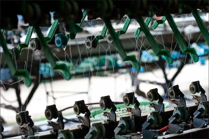 А на этом единственном станке делают нити по такому же принципу как и остальные, но только толстые и с узлами, буклированные нити.