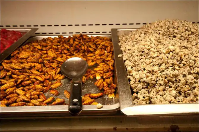 Это фото я сделала еще в прошлом году в COOP–маркете в мясном отделе. Тогда я и не подозревала, что это «шелковые» личинки. Я не уверена на 100%, но очень похожи и по логике подходит. Иначе куда им еще девать личинки отработанные?