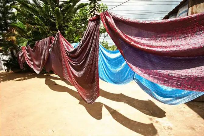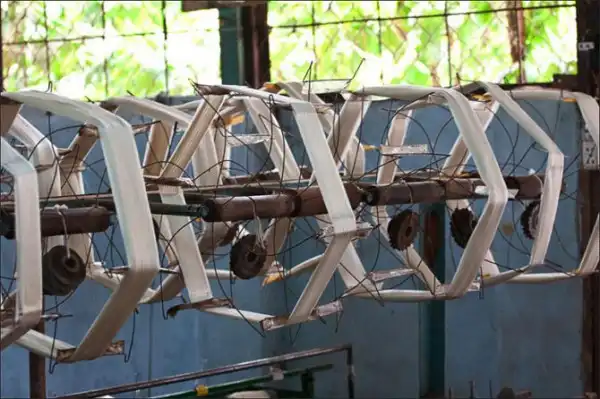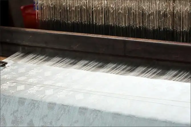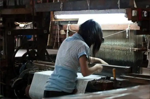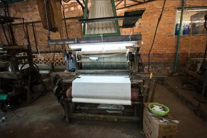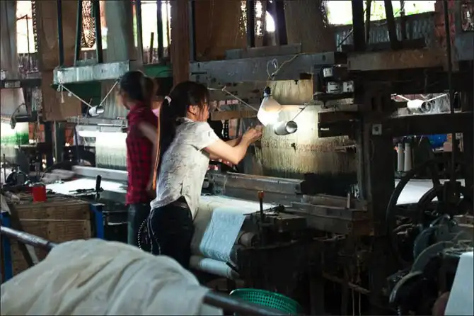 2. Где вытягивают нити. Тут же еще немного ткут ткань.