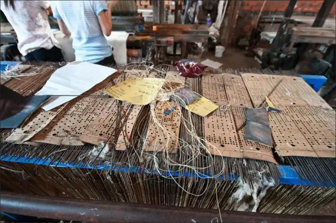 Еще тут есть несколько ткацких станков, где ткут простую ткань. Наверху, левее станка, видно висящую стопку перфокарт или как это еще назвать.